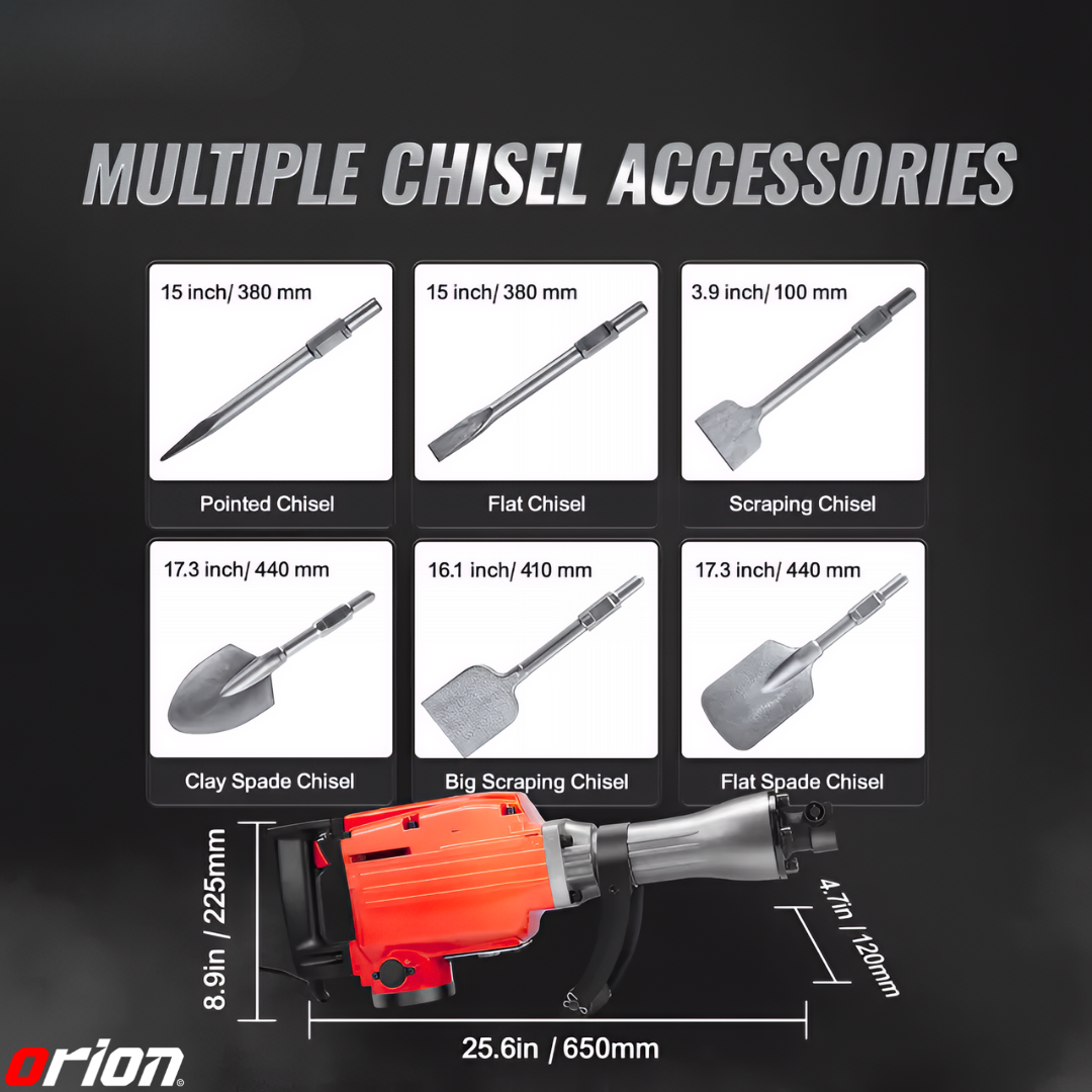 No setup required — simply plug it in, attach your chosen chisel bit, and you’re ready to start. The Orion Breaker™ is designed for instant, hassle-free operation right out of the box.